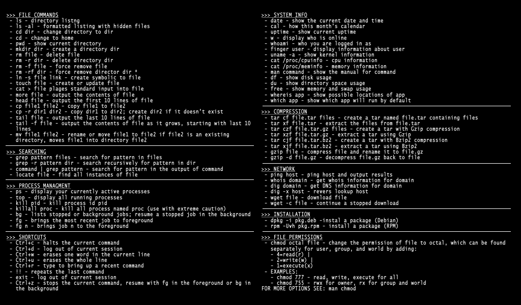 - rm: Apaga arquivos, vem de remove, exemplo: rm -Rf pasta_arquivo, tomar cuidado com rm * pois apaga tudo e não pede para confirmar